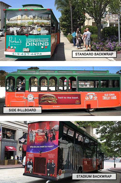 The WHATThe fleet of Old Town Trolley vehicles are now available for national advertising. Our trolleys serve as ‘rolling billboards’ that travel in and around densely populated city streets and crowded tourist locations, leaving a lasting impact on pedestrians, motorists and passengers. Reach customers with a bold and creative message, that can't help but be seen.